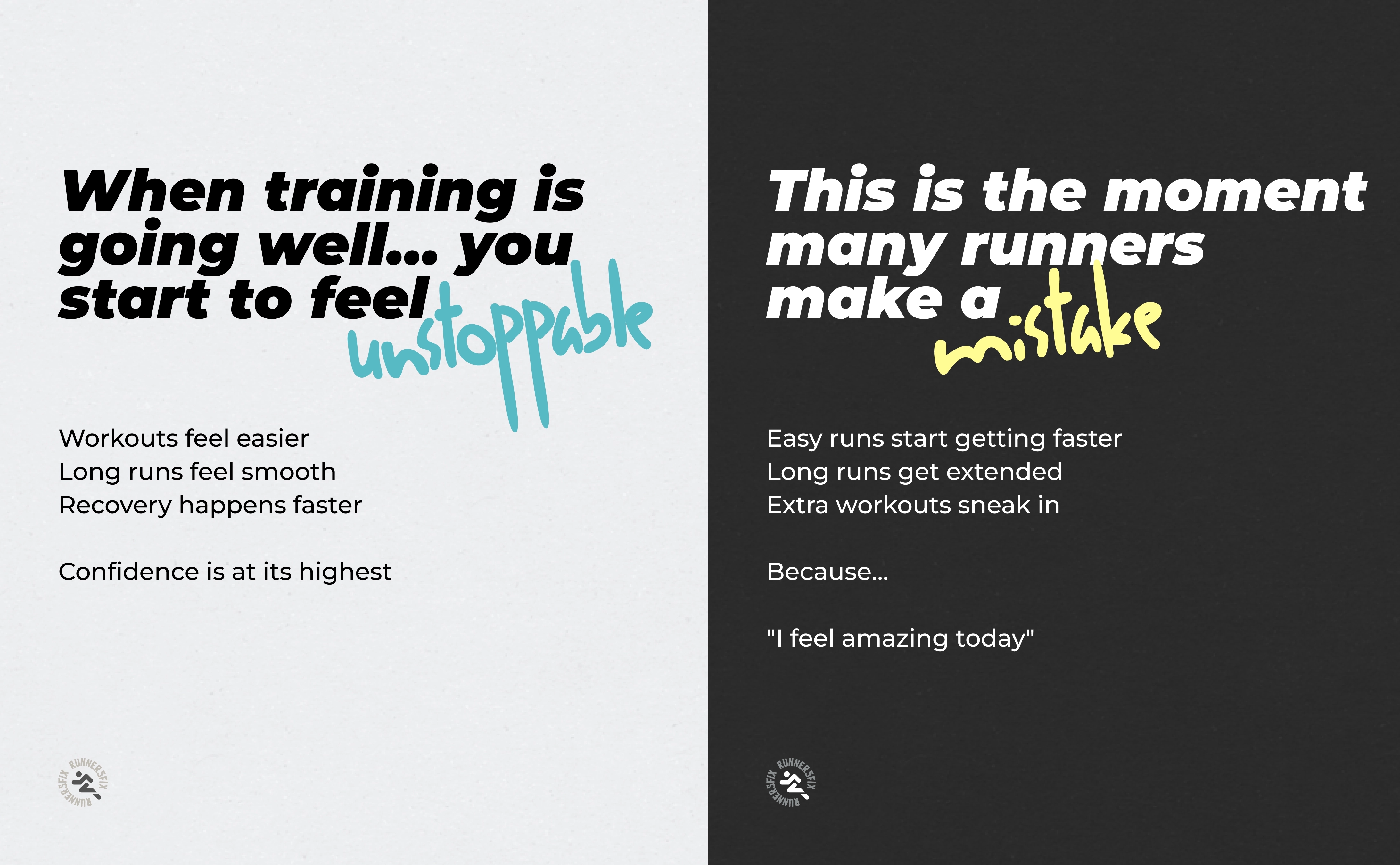 When everything is going right, it’s very easy for a runner to start pushing just a little bit more than they should. Maybe an easy run gets a little faster or a long run gets extended because “I feel amazing today.” Individually these types of things may not seem like a big deal but when you stack them on top of an already demanding training block that’s often when little issues begin to appear. Like an injury issue for example. I would say this is the most common issue when a runner gets too greedy along with burning themselves out even before the taper rolls around.