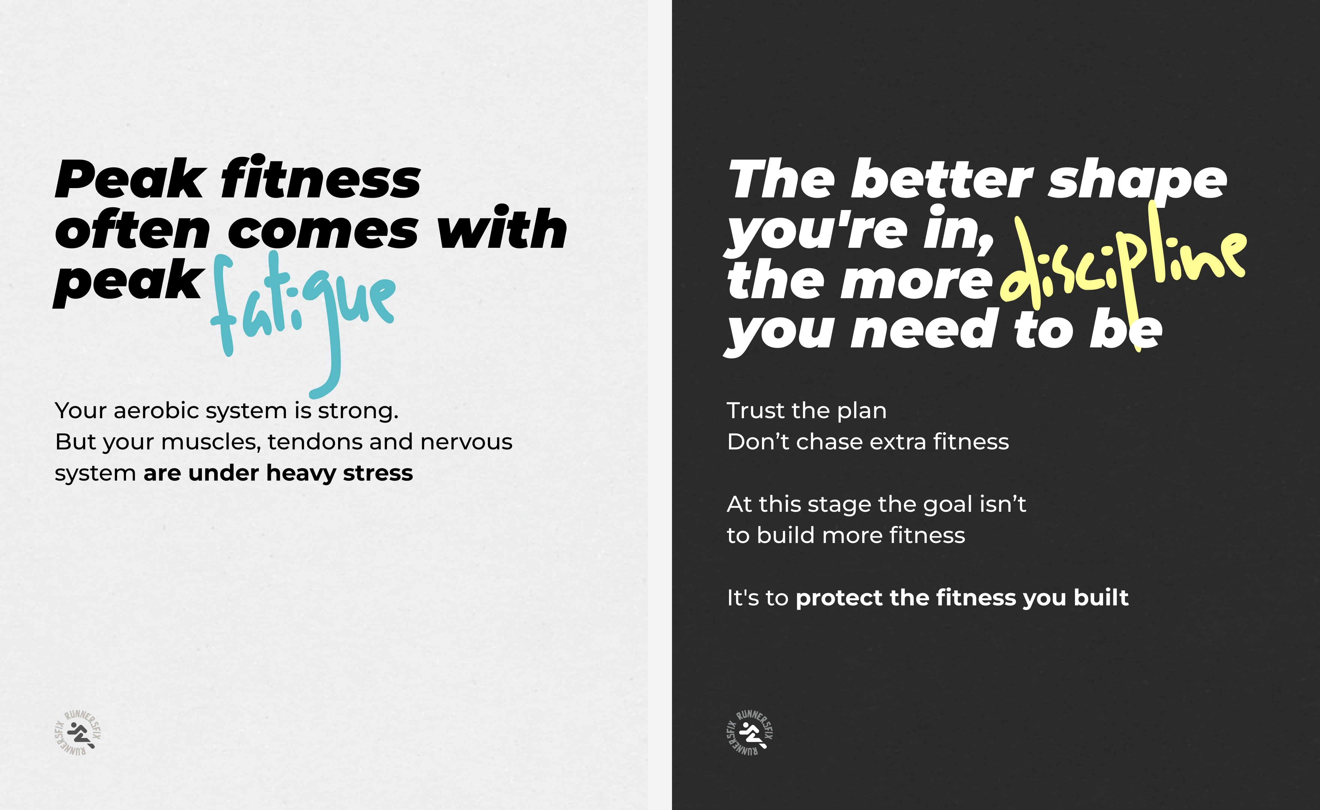 Ironically, these problems tend to show up when fitness is at its highest. It’s not because the runner suddenly became fragile. It’s usually because peak fitness also comes with peak fatigue. Fitness and fatigue go hand in hand with each other. A lot of runners don’t realize that the moment they feel their strongest is often when their body is also carrying the largest amount of accumulated fatigue from weeks or months of training. The aerobic system is stronger than ever but the muscles/tendons and the nervous system are all working overtime just to keep up with the workload. That’s where the responsibility part comes in.